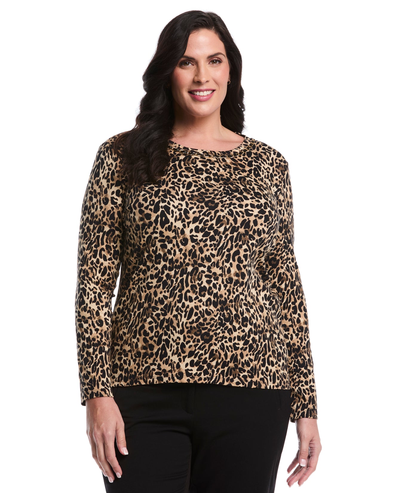 This Rafaella women's top gives your look stylish edge. Featuring an all-over animal print pattern with chain leather detailing at the neck, this women's long sleeve shirt delivers trendy, eye-catching style from day to night. The cotton ribbed fabric adds more visual interest while the classic fit and crew neck design makes for easy wear.