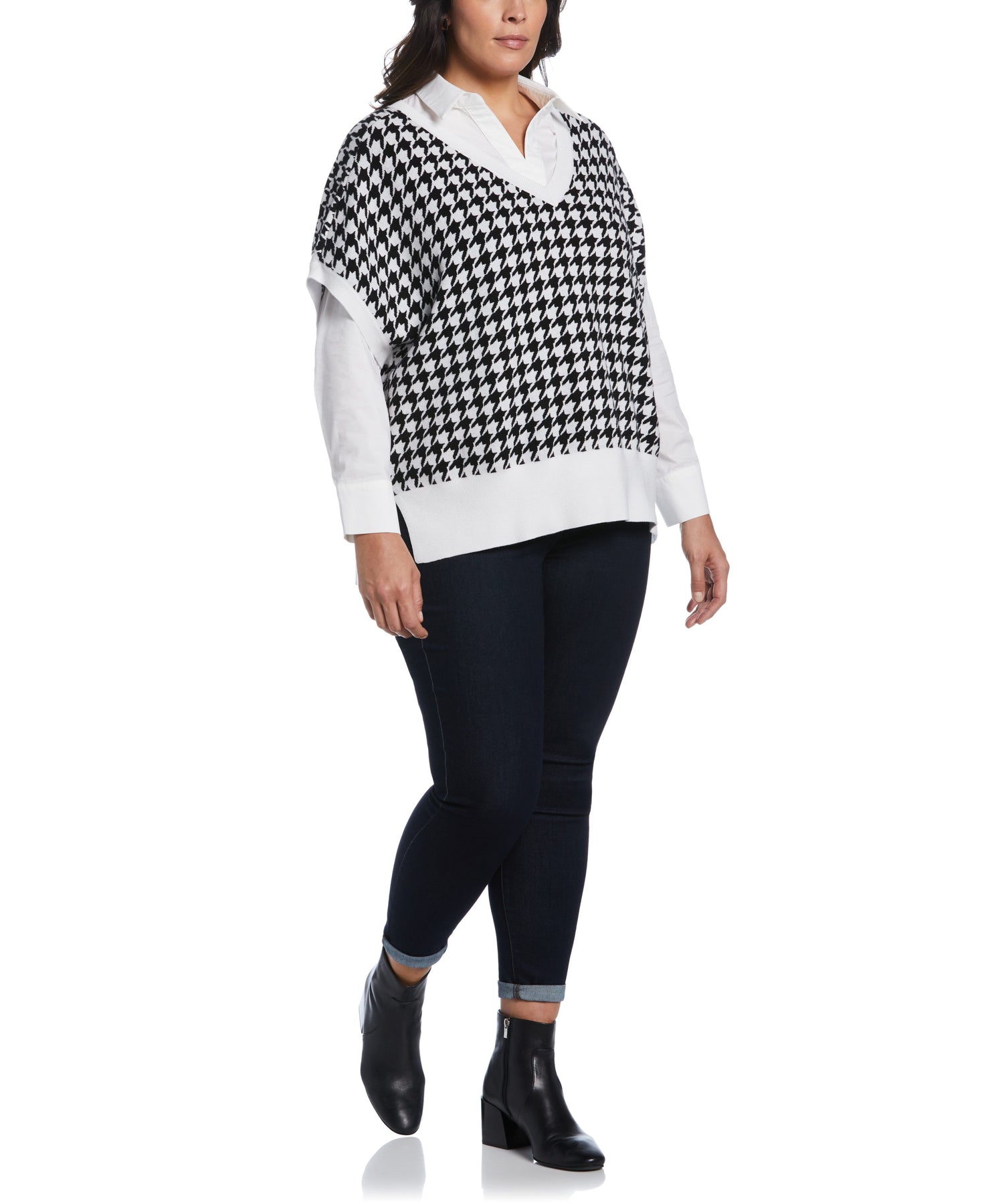 Add some preppy style to any outfit with this stylish houndstooth-patterned women’s sweater vest from Ella. The women’s vest is crafted from a soft and lightweight jersey knit fabric, with a slightly oversized fit that’s easy to pull over your shirts and blouses for a sophisticated layered look. The sweater vest has a flattering soft V-neck, and it’s slightly longer at the back for a subtle hi-low effect. Side slits allow for greater ease of movement, while solid-colored ribbed trim along the neckline, sleeve openings and hem adds a classic finishing touch to the design.