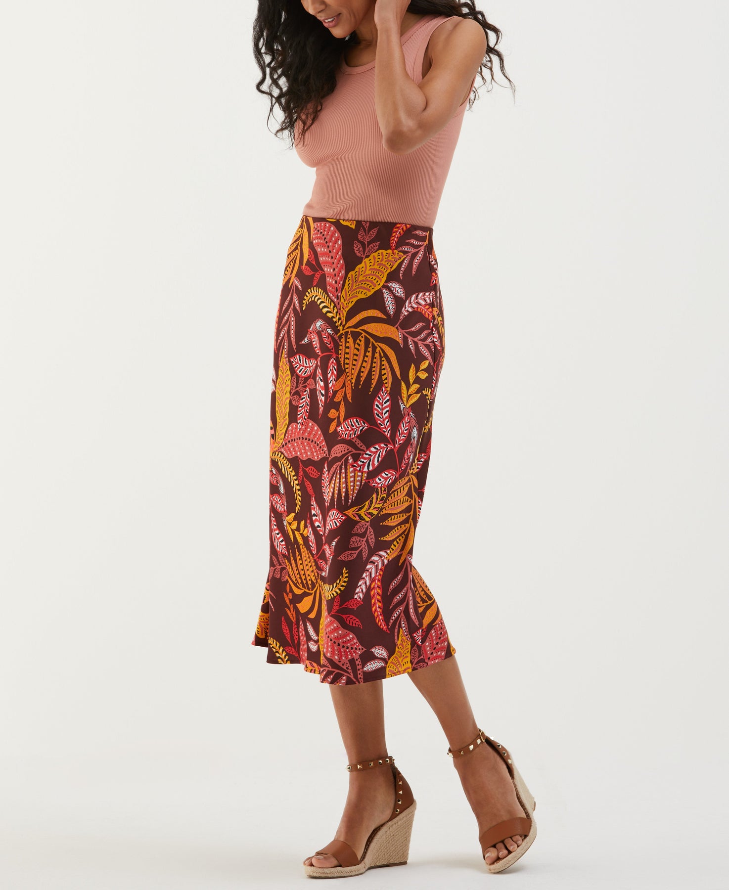 Leaf Print Shine Midi Bias Skirt
