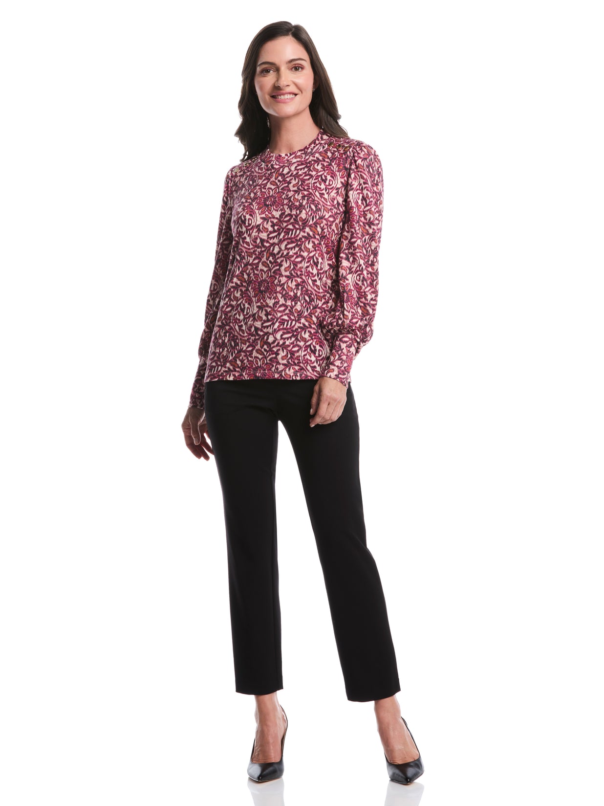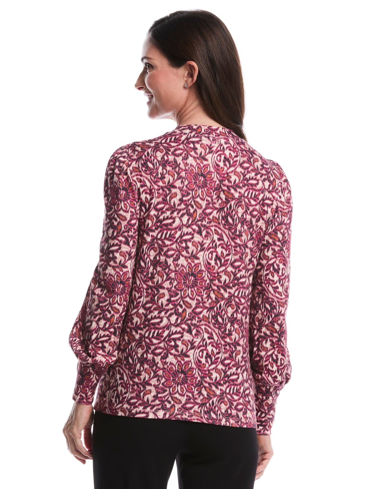 Comfortable and elegantly stylish, this Rafaella women's top will become one of your go-to pieces this season. The pretty paisley pattern, gold rivets and puff sleeve detailing on this long sleeve top dress up any outfit, allowing you to go seamlessly from day to night. It's crafted from a texture knit fabric with stretch for easy wear.