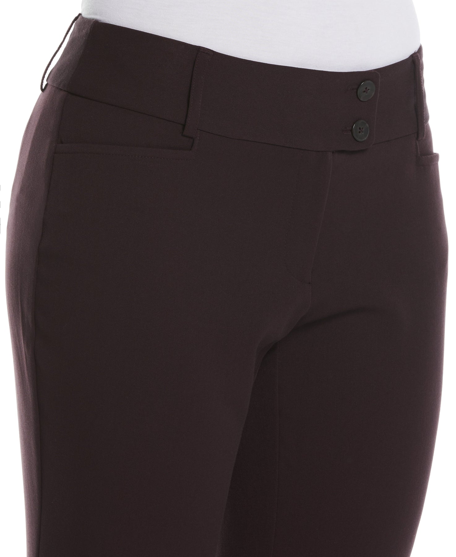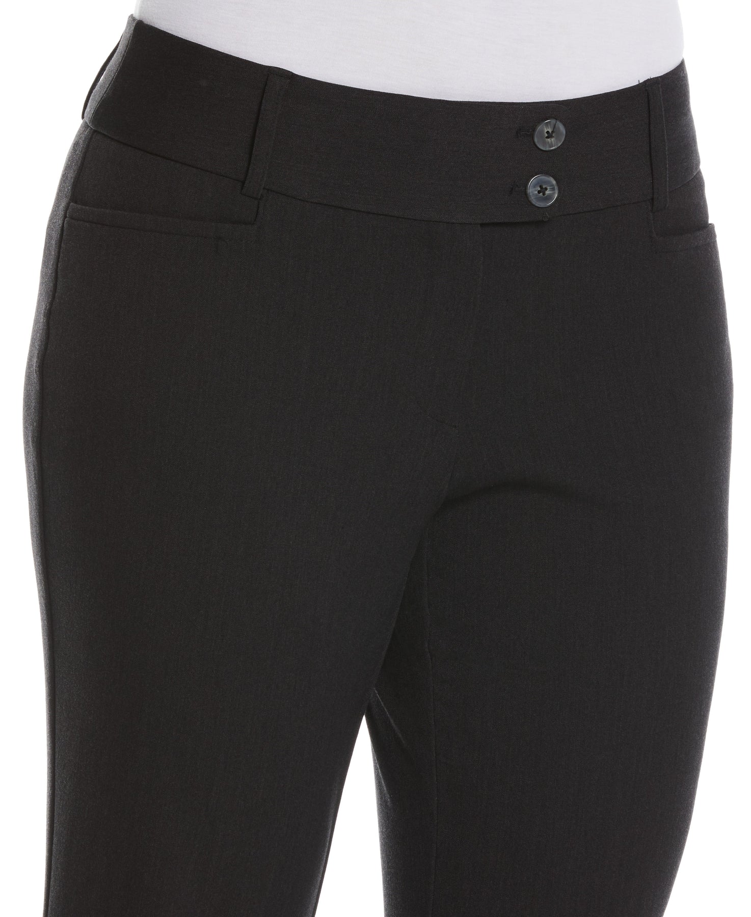Elevate your professional style with these Rafaella pants for women, featuring a full-length boot cut silhouette that styles perfectly with your office wear. Designed for both style and comfort, these ladies' pants also feature a curvy fit, wide waistband and a stretch gabardine fabric for a flattering and comfortable feel. The button and fly closure plus belt loops offer a smart finishing touch while the front and back pockets provide functionality and convenience for the modern career woman. Stylish and functional, these ladies' trousers are a versatile addition to your work wardrobe.