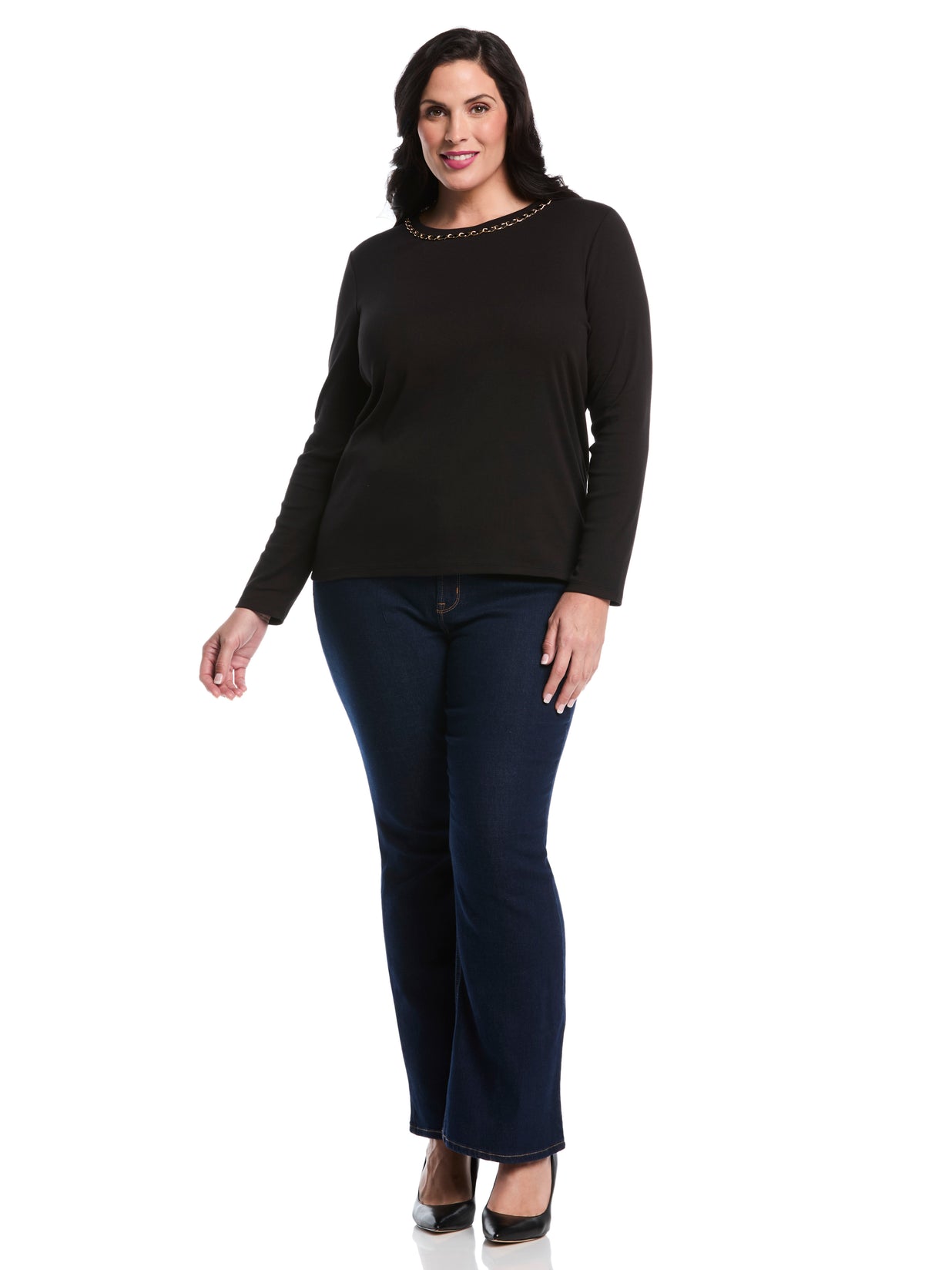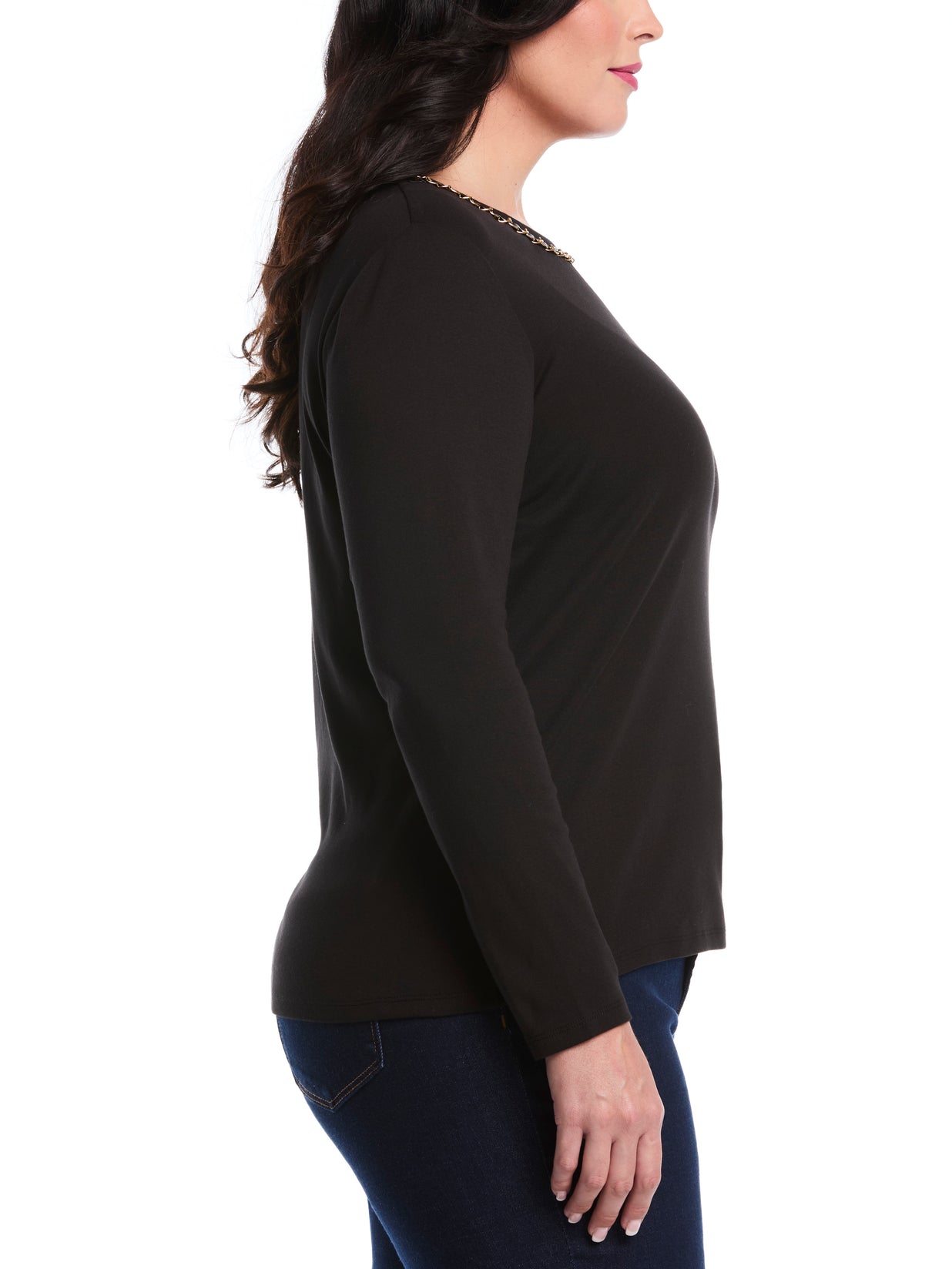 When it comes to this women's top from Rafaella, style is all about the details. Designed to elevate your everyday looks, this long sleeve top features a faux leather chain at the neckline for a decorative and unique finishing touch. Crafted from cotton knit fabric, this women's top is as comfortable as it is stylish. Plus, the solid color design makes it easy to style with a range of bottoms.