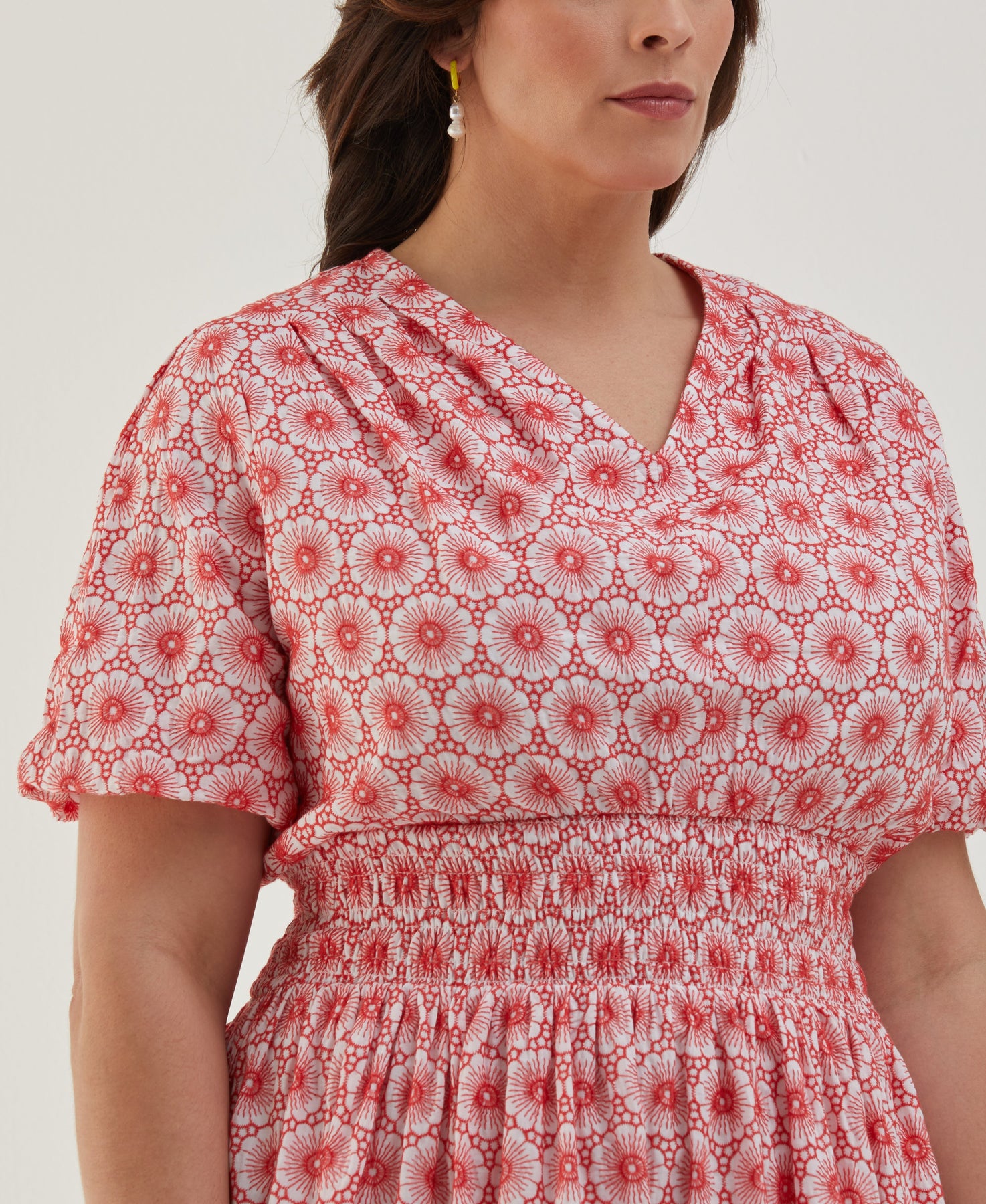 Plus Size Daisy Embroidered Smocked Puff Sleeve Dress