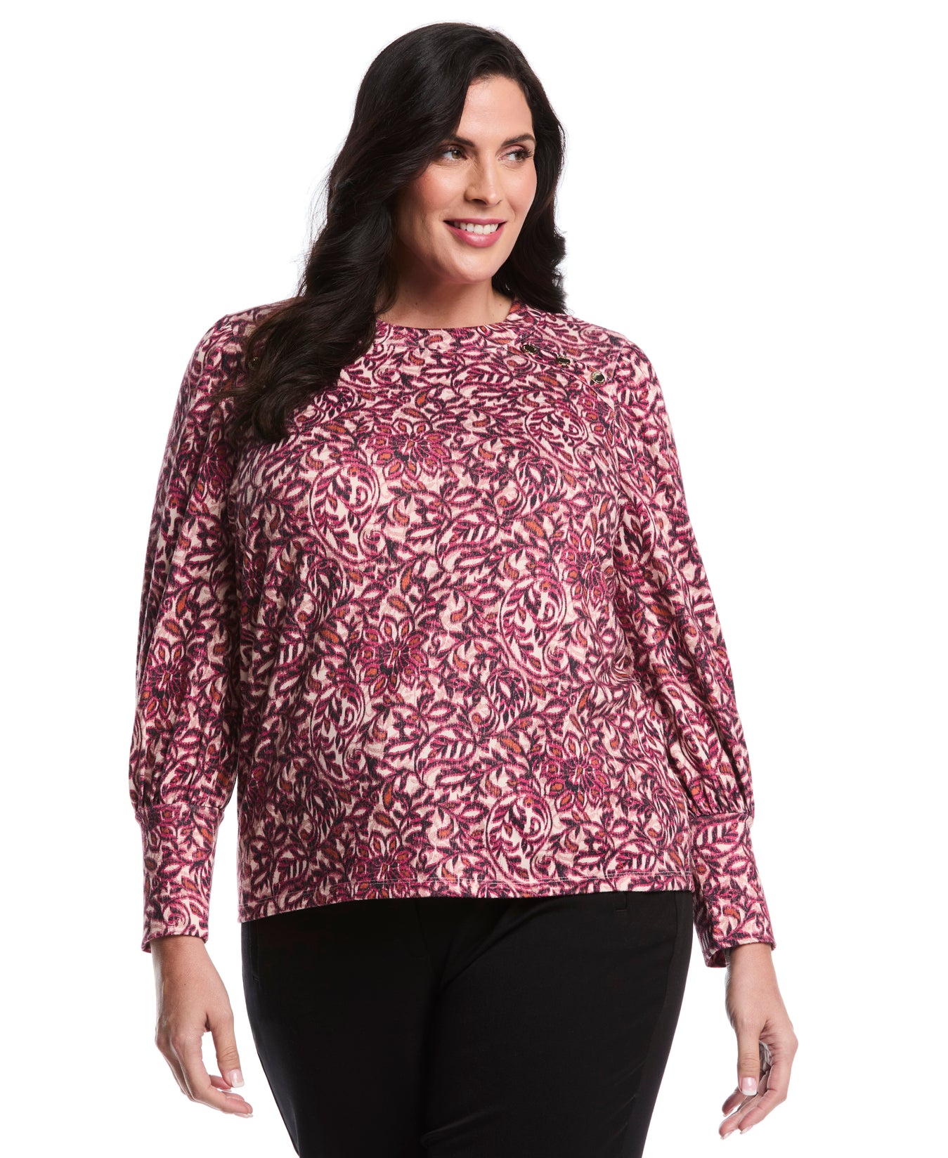 Comfortable and elegantly stylish, this Rafaella women's top will become one of your go-to pieces this season. The pretty paisley pattern, gold rivets and puff sleeve detailing on this long sleeve top dress up any outfit, allowing you to go seamlessly from day to night. It's crafted from a texture knit fabric with stretch for easy wear.