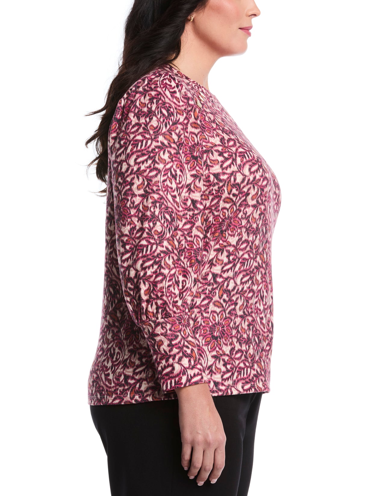 Comfortable and elegantly stylish, this Rafaella women's top will become one of your go-to pieces this season. The pretty paisley pattern, gold rivets and puff sleeve detailing on this long sleeve top dress up any outfit, allowing you to go seamlessly from day to night. It's crafted from a texture knit fabric with stretch for easy wear.