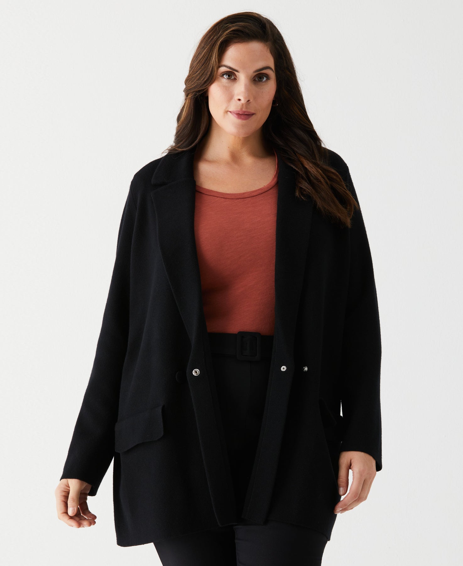 Stylish and comfortable, this Ella Rafaella women's blazer is your next go-to staple when it comes to office wear. Expertly crafted from luxe Milano sweater knit fabric, this women's jacket has a comfortable and cozy feel while the double-breasted silhouette and self fabric snap button closure adds a sleek, polished look. The notched lapel and functional front flap pockets add a smart touch, making this women's blazer jacket the perfect choice for any professional setting. The sleek and elevated design allows you to seamlessly transition this women's office wear piece from desk to dinner for easy, versatile wear.