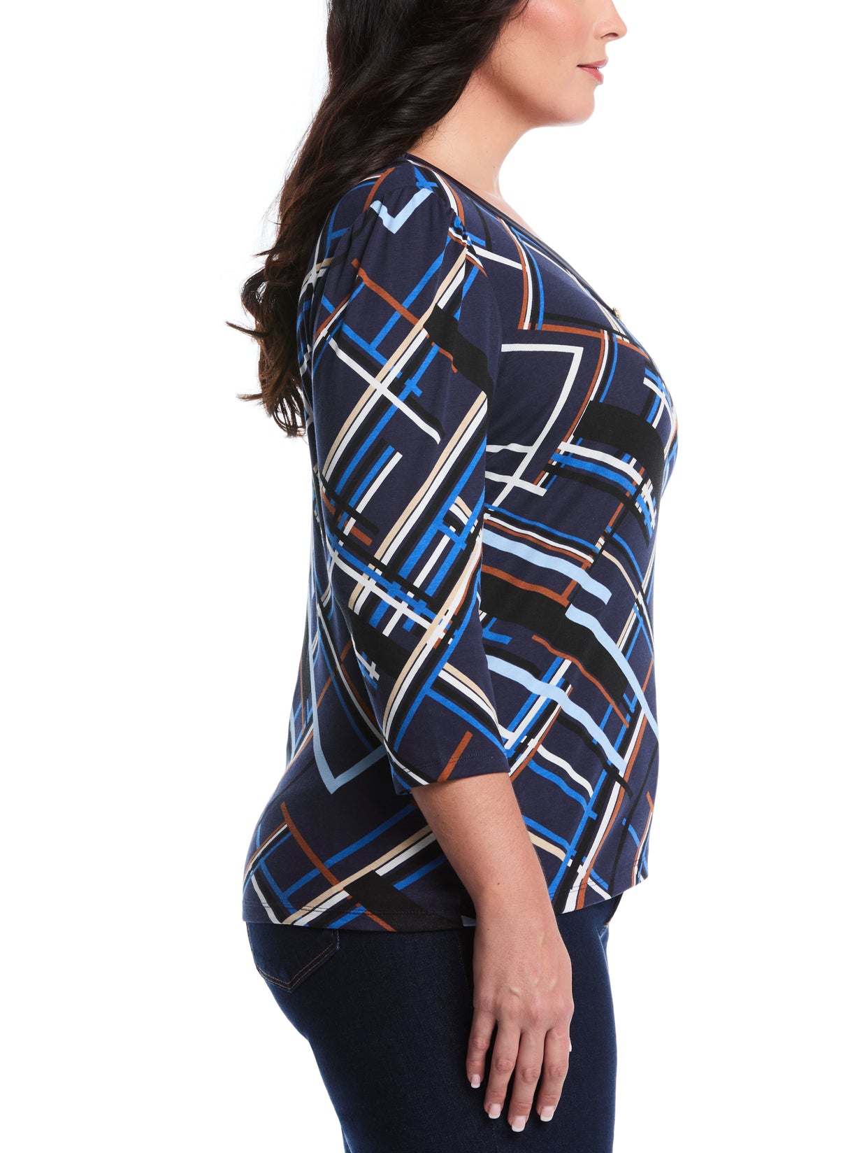 NEW! Plus Size Tossed Stripe Print 3/4 Puff Sleeve V-Neck Top