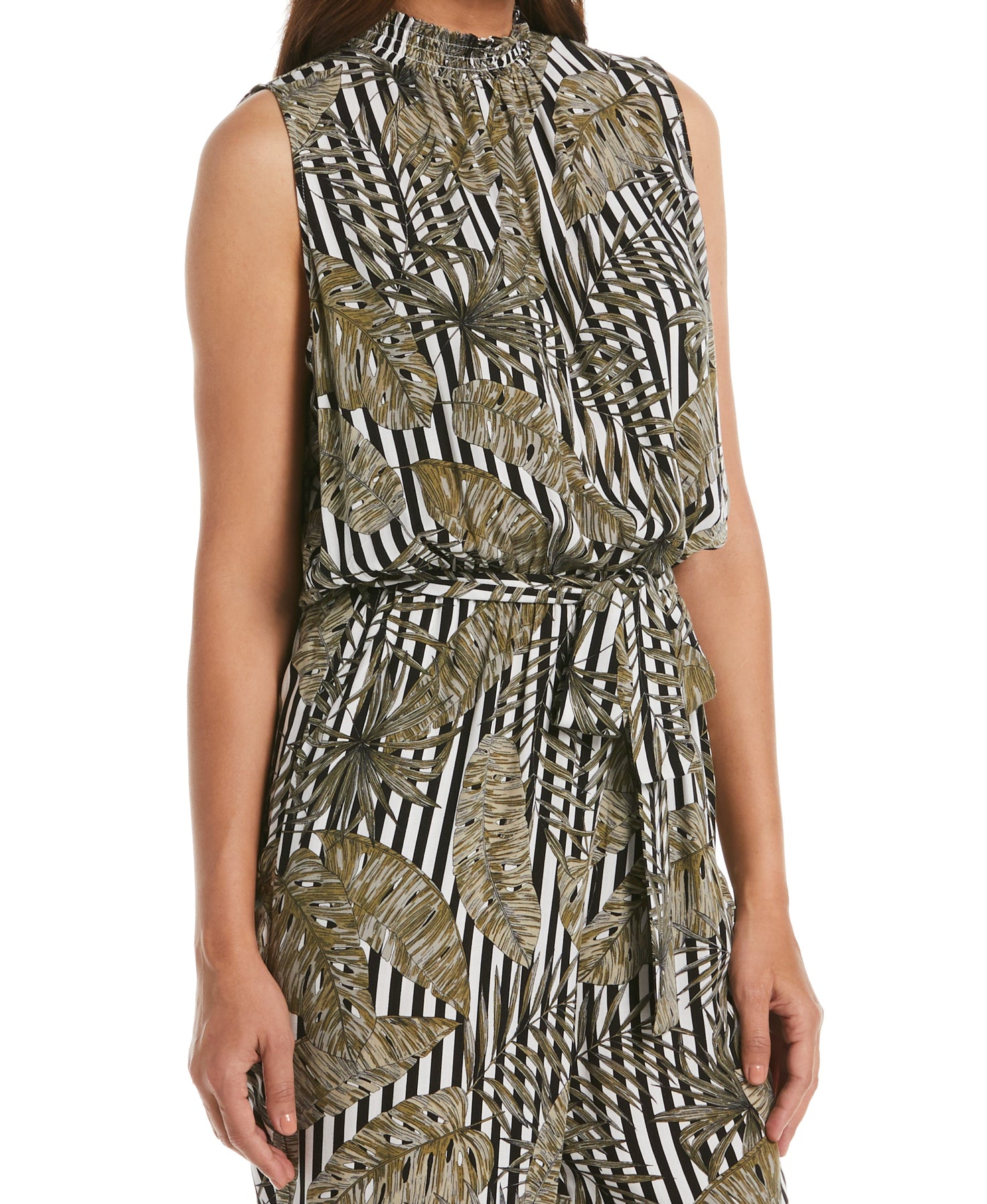 Made from a soft and cool challis fabric, this printed jumpsuit from Rafaella will help you move through spring and summer days in comfort and style. The women’s jumpsuit has an elastic waistband and a matching fabric tie to help ensure a flattering, customized fit. The mock neck is smocked for eye-catching texture. Front pockets help to keep small essentials within easy reach while you’re on the go, while the ankle length design is great for highlighting your favorite pumps or sandals.
