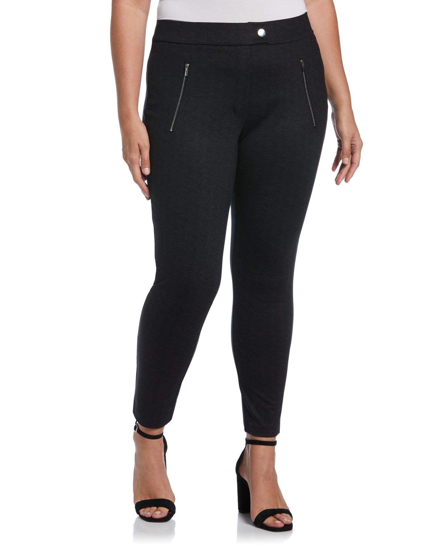Pull on these stylish and comfortable Rafaella women's pants for a sleek look this season. Crafted from a polyester, rayon and spandex ponte fabric, these ladies' pants offer comfortable stretch as you bend and move. They're equipped with a slimming panel for a smooth shape and have an encased elastic waistband for a flexible fit. Faux zippered pockets and a faux fly add classic detailing while maintaining the sleek silhouette of these pull-on pants.