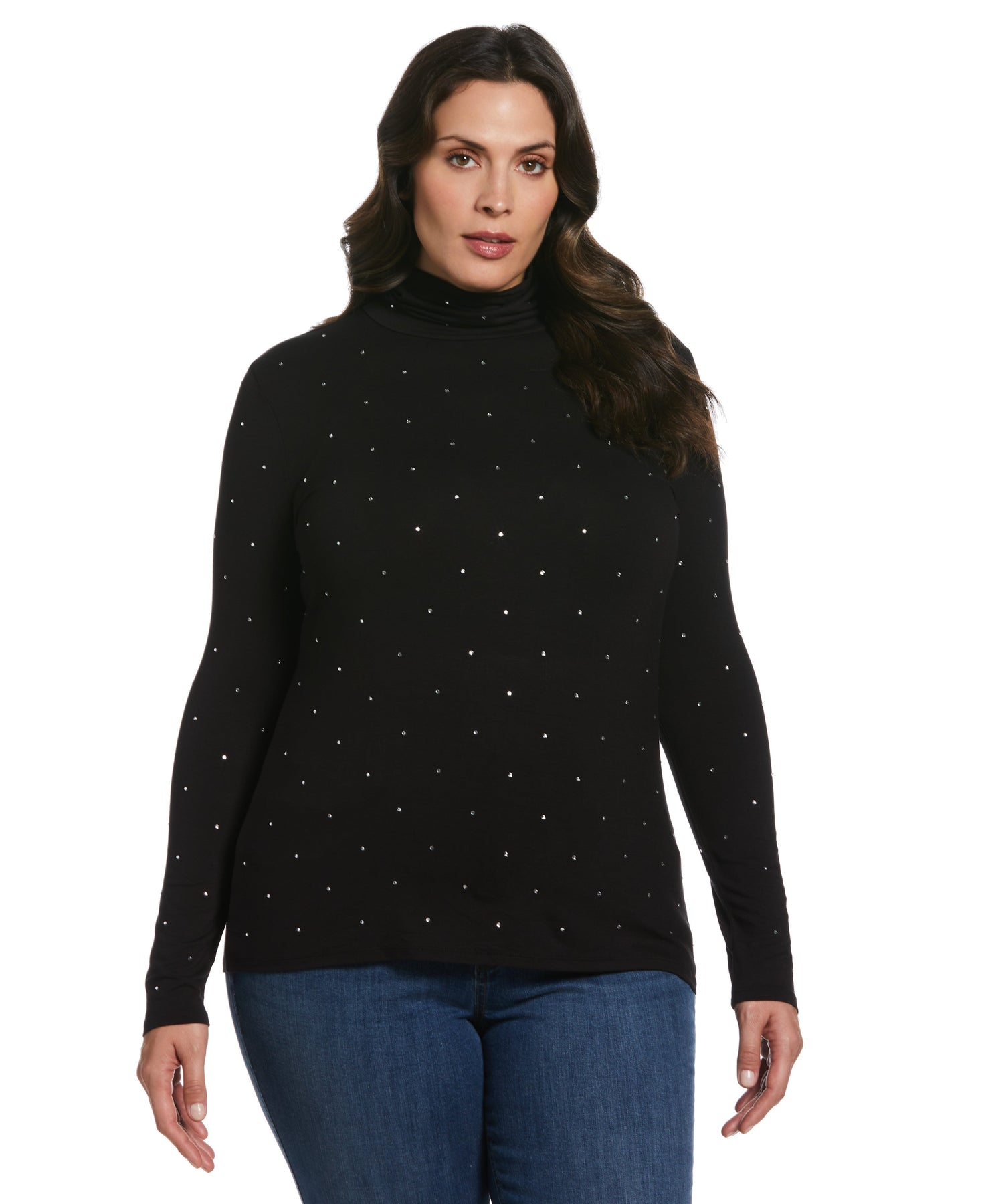 Add some sparkle to your look with this fun and fashionable Rafaella women's turtleneck. This long sleeve top is embellished with rhinestones for eye-catching glamor that instantly elevates any outfit. The high turtleneck collar offers warmth and timeless style and jersey fabrication ensures a soft feel for all-day comfort.