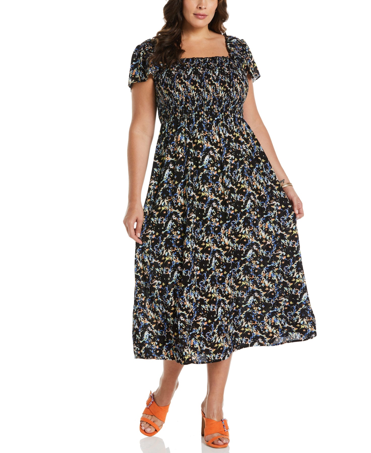 Smocking on the bodice brings both eye-catching texture and a flattering fit to this Ella midi dress. The comfortable day dress is crafted from a soft fabric that drapes beautifully over your curves. The ruffle sleeves flutter elegantly in the breeze, adding a stylish finishing touch.
