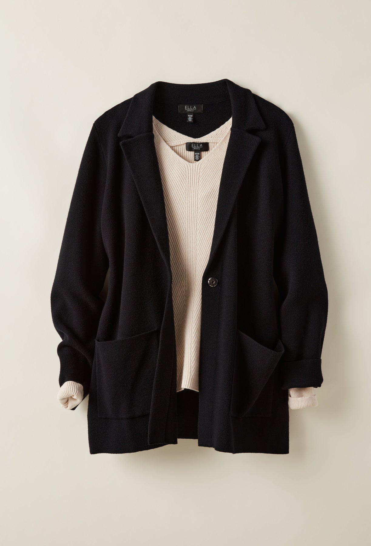 Equal parts cozy and sophisticated, this Ella women’s blazer is crafted from a soft sweater knit fabric for all-day comfort. Great for a sleek, streamlined modern look, the women’s jacket has a hidden snap closure. Notched lapels and two front pockets complete the clean, versatile design.