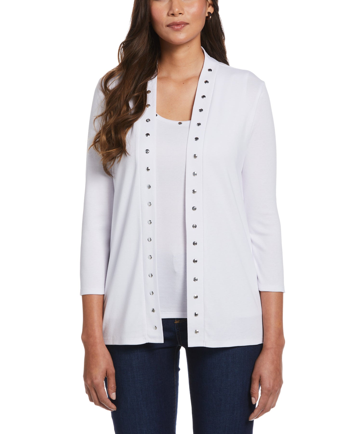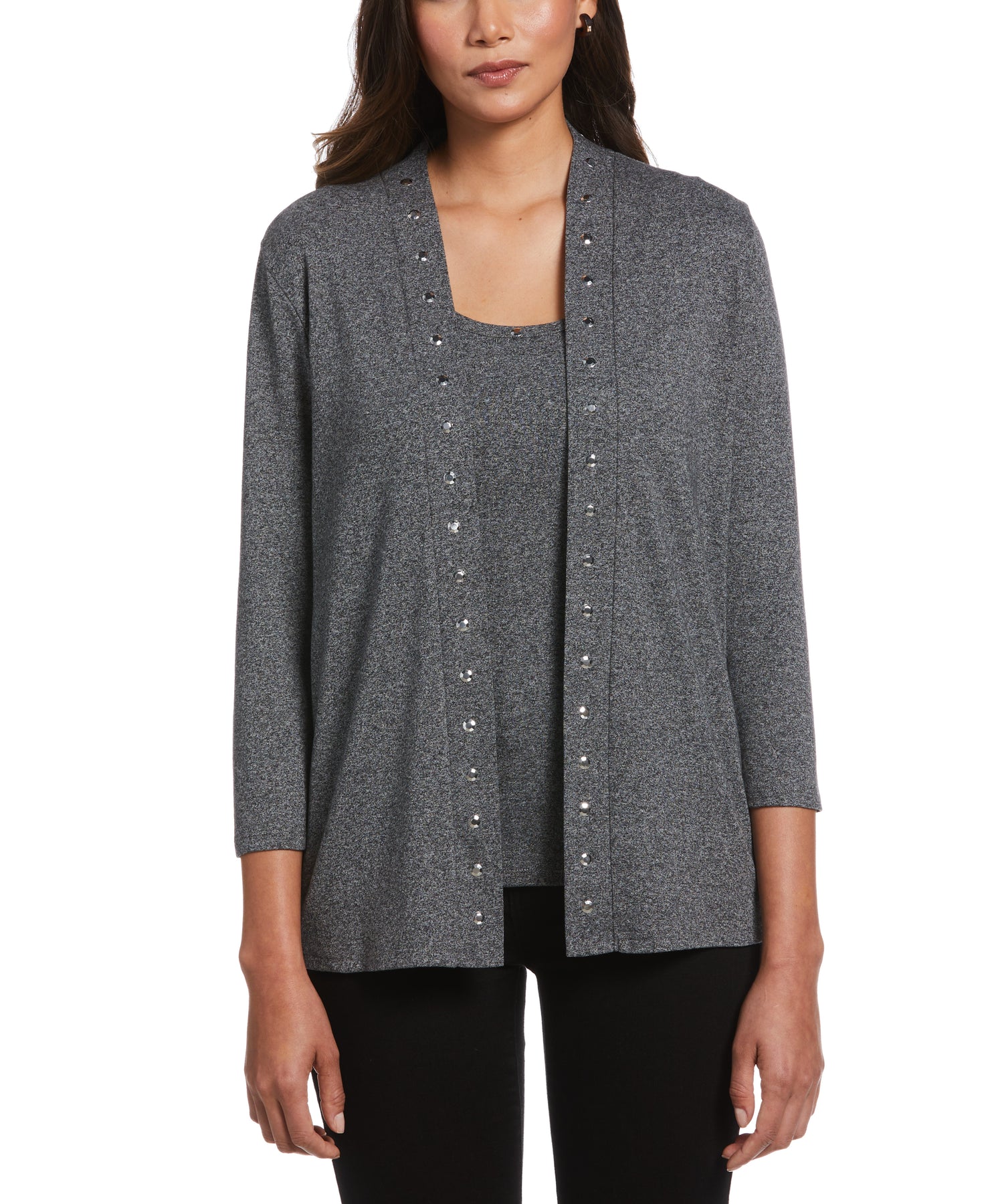 Silver-toned studs along the front neckline add some subtle edge to this versatile women’s tank top from Rafaella. Ideal for layering under a cardigan at the workplace or dining out with friends, this ladies’ top has a comfortable classic fit. The women’s sleeveless top is crafted from a ribbed fabric for a textured look and has a hint of flattering stretch.