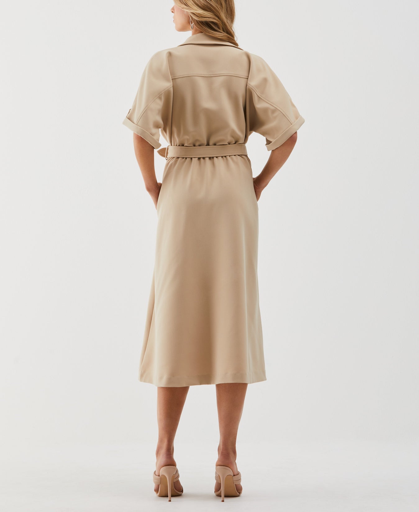 Made with durable and breathable gabardine fabric, this solid-colored ELLA Rafaella shirt dress offers an elegant yet casual look perfect for everyday wear. The utility shirt dress comes equipped with two sets of pockets to keep essential items close, and it has an elasticated waist to help ensure a flattering fit. Add the removable belt to give it shape and an eye-catching gold-toned accent, or remove it for a more subdued, relaxed look. Details like roll tabs and functional buttons on the sleeves let you customize the look even further.
